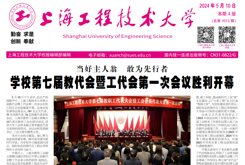 5月10日下午2时,在庄严的国歌声中,上海工程技术大学第七届教代会暨工代会第一次会议在松江校区志宏堂隆重开幕。全体在校校领导出席会议,181名正式代表、15名列席代表、16名特邀代表参加会议。上海市教育工会副主席陶文捷代表市教育工会出席并讲话,同济大学工会常务副主席李建昌代表兄弟高校致贺词。会议由校党委副书记、工会主席史健勇主持。