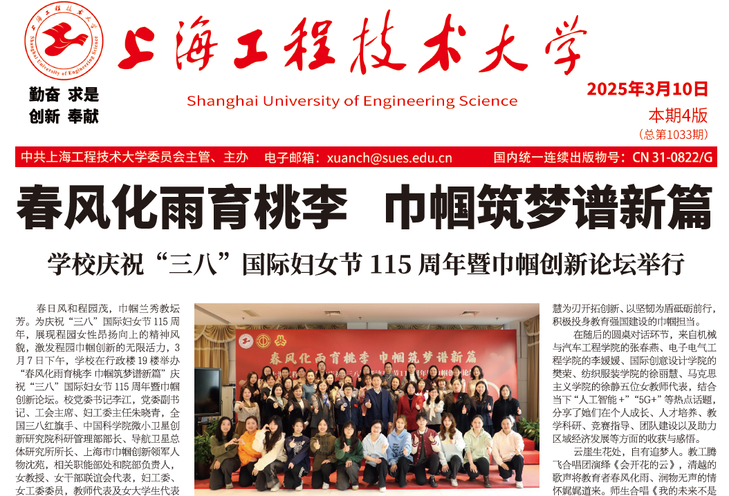 3月10日.pdf第一版春风化雨育桃李巾帼筑梦谱新篇学校庆祝“三八”国际妇女节115周年暨巾帼创新论坛举行春日风和程园茂,巾帼兰秀教坛芳。为庆祝“三八”国际妇女节115周年,展现程园女性昂扬向上的精神风貌,激发程园巾帼创新的无限活力,3月7日下午,学校在行政楼19楼举办“春风化雨育桃李巾帼筑梦谱新篇”庆祝“三八”国际妇女节115周年暨巾帼创新论坛。校党委书记李江,党委副书记、工会主席、妇工委主任朱晓青,全国三八红旗手、中国科学院微小卫星创新研究院科研管理部部长、导航卫星总体研究所所长、上海市巾帼创新领军人物沈苑,相关职能部处和院部负责人,女教授、女干部联谊会代表,妇工委、女工委委员,教师代表及女大学生代表参加活动。李江为荣获2023-2024年度上海市教育系统三八红旗集体和三八红旗手、2023-2024年度校三八红旗集体及三八红旗手荣誉的教研团队和教职工代表颁奖,激励广大程园女教职工以榜样为引领,比学赶超、开拓奋进、砥砺前行,共同撑起上工程教育事业“半边天”。朱晓青向出席活动的各位领导、嘉宾及全校女教职工、女大学生致以节日的问候和美好的祝福。她寄语广大程园女性要永葆“理想信念”之志,争