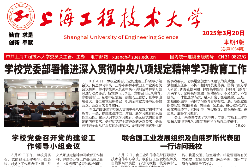 3月20日.pdf第一版学校党委部署推进深入贯彻中央八项规定精神学习教育工作3月20日,学校党委召开党的建设工作领导小组会议,传达学习中央、上海市委和市教卫工作党委有关会议精神,并对学校深入贯彻中央八项规定精神学习教育进行动员部署。校党委书记李江,党委副书记朱晓青,党委副书记、纪委书记孟星,副校长王岩松、夏春明出席会议,各二级党组织书记、机关全体党支部书记参加会议。会议由朱晓青主持。李江详细部署学校深入贯彻中央八项规定精神学习教育。一是,提高政治站位,增强开展学习教育的积极性主动性。充分认识本次学习教育,是弘扬党的优良传统的内在要求,是密切党群干群关系的必然要求,是纵深推进全面从严治党的纪律要求,是推进中国式现代化的实践要求,切实增强加强作风建设的实效性。二是,紧扣重点任务,不折不扣抓好贯彻落实。围绕“抓好学习研讨、抓好查摆问题、抓好集中整治、抓好开门教育”开展学习,坚持聚焦主题、简约务实,不分批次、不划阶段,一体推进学查改,融入日常、抓在经常。三是,加强组织领导,确保学习教育有序有效开展。各级党组织要切实增强使命感、责任感、紧迫感,精心做好安排,强化责任传导、宣传引导、督促指导,确保