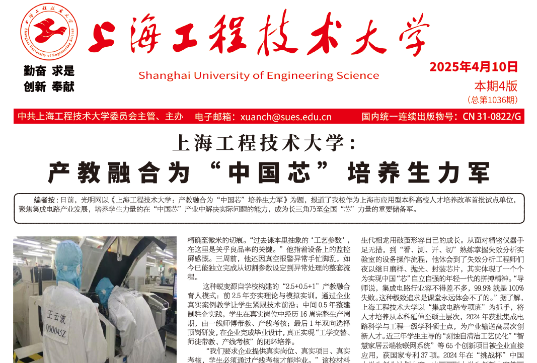 4月10日.pdf第一版上海工程技术大学:产教融合为“中国芯”培养生力军编者按 日前,光明网以《上海工程技术大学:产教融合为“中国芯”培养生力军》为题,报道了yd2333云顶电子游戏作为上海市应用型本科高校人才培养改革首批试点单位,聚焦集成电路产业发展,培养学生力量的在“中国芯”产业中解决实际问题的能力,成为长三角乃至全国“芯”力量的重要储备军。顶岗实习半年,上海工程技术大学2021级本科生李木子已能熟练操作价值千万的测试设备。在集成电路龙头企业上海凯虹科技电子有限公司的生产线上,他手持测试针,目光紧盯屏幕上芯片参数的波动,一旁的产业导师频频点头:“现在的学生,好好培养能当‘准工程师’了”。作为上海市应用型本科高校人才培养改革首批试点单位,上海工程技术大学聚焦集成电路全产业链对高端创新应用型人才的迫切需求,产学研深度合作,为学生提供更多实践机会,培养他们在“中国芯”产业中解决实际问题的能力,成为长三角乃至全国“芯”力量的重要储备军。走进凯虹科技Molding车间,2022级学生肖越飞正全神贯注地操作切割机。激光划过硅片,留下一道精确至微米的切痕。“过去课本里抽象的‘工艺参数’,在这里是关乎良品率的关键。”