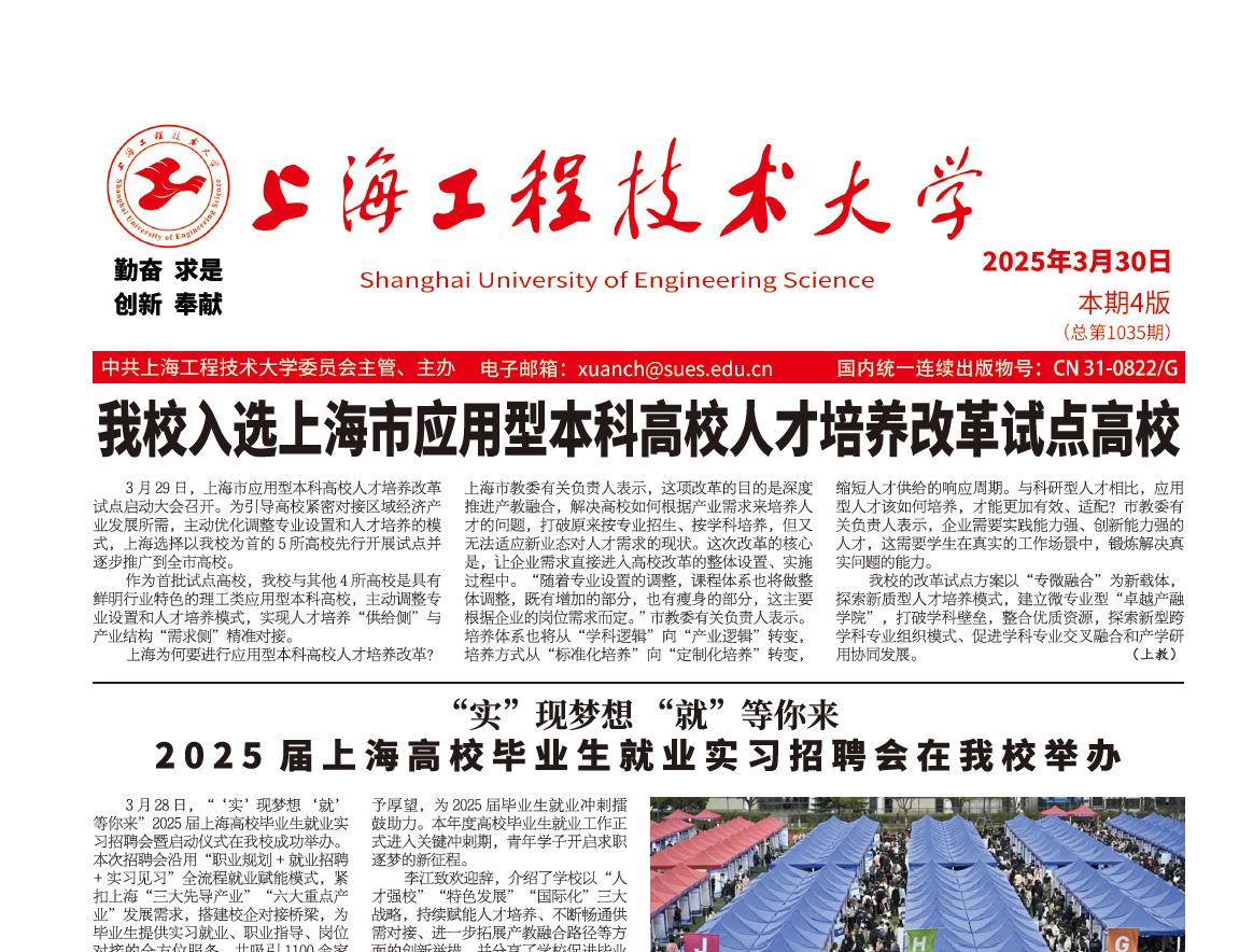 3月30日.pdf第一版yd2333云顶电子游戏入选上海市应用型本科高校人才培养改革试点高校3月29日,上海市应用型本科高校人才培养改革试点启动大会召开。为引导高校紧密对接区域经济产业发展所需,主动优化调整专业设置和人才培养的模式,上海选择以yd2333云顶电子游戏为首的5所高校先行开展试点并逐步推广到全市高校。作为首批试点高校,yd2333云顶电子游戏与其他4所高校是具有鲜明行业特色的理工类应用型本科高校,主动调整专业设置和人才培养模式,实现人才培养“供给侧”与产业结构“需求侧”精准对接。上海为何要进行应用型本科高校人才培养改革?上海市教委有关负责人表示,这项改革的目的是深度推进产教融合,解决高校如何根据产业需求来培养人才的问题,打破原来按专业招生、按学科培养,但又无法适应新业态对人才需求的现状。这次改革的核心是,让企业需求直接进入高校改革的整体设置、实施过程中。“随着专业设置的调整,课程体系也将做整体调整,既有增加的部分,也有瘦身的部分,这主要根据企业的岗位需求而定。”市教委有关负责人表示。培养体系也将从“学科逻辑”向“产业逻辑”转变,培养方式从“标准化培养”向“定制化培养”转变,缩短人才供给的响应周期。与科研型人才相比,应用型人才该如何培