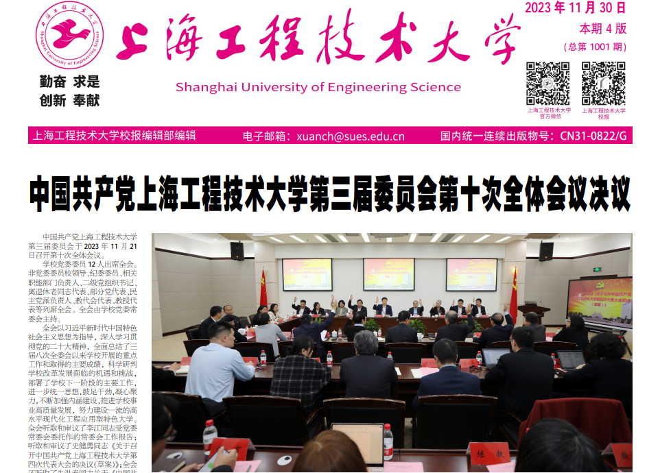 11月30日.pdf第一版中国共产党上海工程技术大学第三届委员会第十次全体会议决议中国共产党上海工程技术大学第三届委员会于2023年11月21日召开第十次全体会议。学校党委委员12人出席全会。非党委委员校领导、纪委委员、相关职能部门负责人、二级党组织书记、离退休老同志代表、部分党代表、民主党派负责人、教代会代表、教授代表等列席全会。全会由学校党委常委会主持。全会以习近平新时代中国特色社会主义思想为指导,深入学习贯彻党的二十大精神,全面总结了三届八次全委会以来学校开展的重点工作和取得的主要成绩,科学研判学校改革发展面临的机遇和挑战,部署了学校下一阶段的主要工作,进一步统一思想,鼓足干劲,凝心聚力,不断加强内涵建设,推进学校事业高质量发展,努力建设一流的高水平现代化工程应用型特色大学。全会听取和审议了李江同志受党委常委会委托作的常委会工作报告;听取和审议了史健勇同志《关于召开中国共产党上海工程技术大学第四次代表大会的决议(草案)》;全会还听取了朱洪春同志关于《中国共产党上海工程技术大学第四次代表大会筹备方案》。全会同意召开第四次代表大会的决议。中国共产党上海工程技术大学第四次代表大会定于2