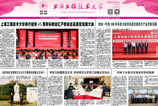 10月30日.1.pdf10月30日.2.pdf第一版上海工程技术大学举行建校45周年科教融汇产教融合高质量发展大会四十五载风雨兼程、四十五载春华秋实。10月28日,上海工程技术大学建校45周年科教融汇产教融合高质量发展大会在志宏堂隆重举行。校党委书记李江主持大会。大会在雄壮的国歌声中开幕。市教委一级巡视员陈睦在致辞中表示,上海工程技术大学建校45年来,始终坚持应用型大学办学定位,坚定不移走好产学合作道路,为上海经济社会高质量发展提供了重要人才支撑。上海市教委将一如既往支持上海工程技术大学的建设发展,同时期待上海工程技术大学更加积极主动对接国家重大战略和上海经济社会发展需求,优化学科专业布局,加大紧缺人才培养力度,提升对产教融合型城市建设的支撑力度。松江区委书记程向民在致辞中与现场嘉宾分享了三个共识:一是要秉持新发展理念不动摇,在逆境中共同推进长三角G60科创走廊国家战略;二是要坚持教育、科技、人才一体化融合发展的导向,要共同推进松江与大学城的融合发展;三是要共同践行人民城市发展理念,加快建设高质量的“科创、人文、生态”现代化新松江。东华大学副校长李炜在致辞中表示,东华大学和上海工程技