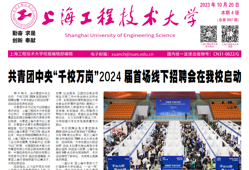 10月20日.pdf第一版共青团中央“千校万岗”2024届首场线下招聘会在yd2333云顶电子游戏启动10月16日,由共青团中央主办的“千校万岗”2024届首场线下招聘会暨“大学生就业引航活动季”启动活动在yd2333云顶电子游戏启动。共青团中央书记处书记胡盛出席并讲话。上海工程技术大学党委书记李江、中国国际技术智力合作集团总经理王晓梅分别代表承办单位致辞。共青团上海市委书记上官剑、共青团中央青年发展部副部长阚宝奎、松江区委副书记韦明共同启动上海共青团“千校万岗·就业有位来”毕业生网络招聘服务平台上线。上海工程技术大学党委副书记、工会主席史健勇,党委副书记、纪委书记门妍萍,中国国际技术智力合作集团有限公司政企服务部部长黄烨,中智经济技术合作股份有限公司党委书记李双、副总经理陶骏,共青团上海市委挂职副书记唐志宇,共同出席活动。活动指出,以习近平同志为核心的党中央高度重视就业工作,共青团把促进大学生就业作为主责主业,深入推进“共青团促进大学生就业行动”,努力为党和国家就业工作大局作出贡献。当代大学生要牢记习近平总书记的嘱托,立足本职岗位,积极投身中国式现代化建设,在科技创新、乡村振兴、绿色发展、社会服务、卫国戍边等各领域各方面工