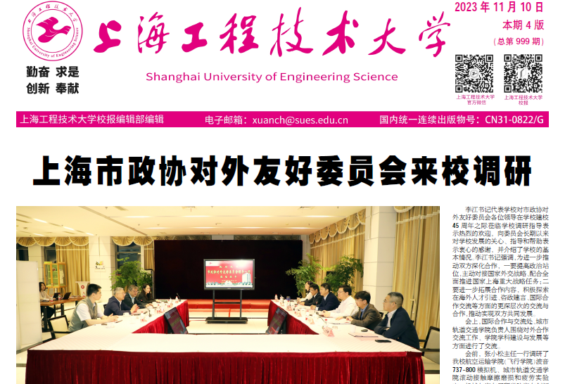 11月10日.pdf第一版上海市政协对外友好委员会来校调研10月31日下午,上海市政协常委、对外友好委员会主任张小松,上海市政协对外友好委员会专职副主任孔戎一行来校调研交流。校党委书记李江,党委常委、副校长夏春明,党委常委、组织部部长朱洪春及党办、国交处、轨道学院负责人参加座谈会。会议由夏春明副校长主持。张小松主任首先感谢工程大一直以来对委员会的支持和帮助,并介绍了委员会的基本情况和近期工作情况。张主任表示将持续支持学校对外交流与合作工作,并就下一步双方合作提出两点建议:一是希望双方进一步建立健全长期联络机制,依托学校资源和委员会对外合作平台,组织委员沙龙、联谊等活动,更好地凝聚力量,实现资源共享;二是充分利用双方资源,携手推动国际友好交流,带动更多的师生出国学习交流,在拓宽国际视野的同时,共同讲好中国故事、上海故事。李江书记代表学校对市政协对外友好委员会各位领导在学校建校45周年之际莅临学校调研指导表示热烈的欢迎,向委员会长期以来对学校发展的关心、指导和帮助表示衷心的感谢,并介绍了学校的基本情况。李江书记强调,为进一步推动双方深化合作,一要提高政治站位,主动对接国家外交战略、配合全面