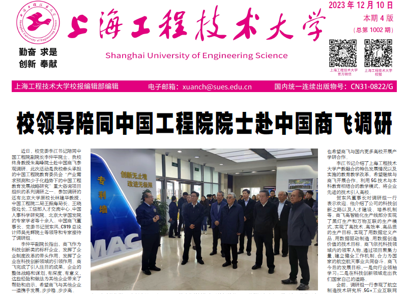 12月10日.pdf第一版校领导陪同中国工程院院士赴中国商飞调研近日,校党委李江书记陪同中国工程院副院长李仲平院士、yd2333云顶电子游戏终身教授朱高峰院士赴中国商飞参观调研。此次活动是yd2333云顶电子游戏牵头承担的中国工程院教育委员会“产业需求预测和少子化趋势下的中国工程教育发展战略研究”重大咨询项目组织的系列调研之一。参加调研的还有北京大学原校长林建华教授,中国工程院二局王振海局长、王晓俊处长,工信部人才交流中心、中国人事科学研究院、北京大学国发院的专家学者等十余人。中国商飞董事长、党委书记贺东风,C919总设计师吴光辉院士等领导和专家接待了调研组。李仲平副院长指出,商飞作为科技创新类的标杆企业,发挥了企业制度改革的带头作用,发挥了企业在科技创新领域的引领作用。商飞完成了引人注目的成果,企业的整体战略和谋划,有深度、有意义,这些经验和做法为其他企业带来了帮助和启示,希望商飞与其他企业一道携手发展,步步稳、步步高。朱高峰院士指出,5G+工业互联网创新实验室的应用体现了科学—技术—工程的贯通,希望商飞在国家政策指引下,在制造强国、大国工程的框架下,将科技更好地融入生产领域。林建华教授指出了教师教学、学生实践同企业发展之