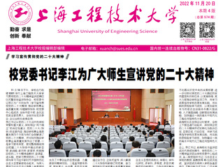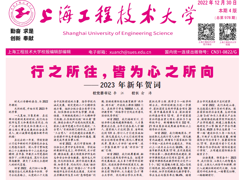 12月30日.pdf第一版行之所往,皆为心之所向——2023年新年贺词校党委书记李江 校长俞涛时光以安静的姿态,与2022年挥别。光阴的笔,开始书写2023年的序章。一元复始,万象更新。在这辞旧迎新的美好时刻,我们向全校师生员工和离退休老同志,向广大海内外校友和长期关心支持工程大事业发展的社会各界友人,致以诚挚的感谢和新年的祝福!在过去的一年里,学校坚持以习近平新时代中国特色社会主义思想为指导,深入学习贯彻党的二十大精神和市十二次党代会精神,在市委、市教卫工作党委的领导下,以踔厉奋发、笃行不怠的昂扬激情,提交了工程大立德树人的时代答卷。回首2022,我们初心如磐,理想信念之光照亮奋斗征程。学习永远在路上,从党的二十大报告中汲取前进的力量,指导学校内涵式发展,制定党的二十大精神实施方案,组织分级分层分类学习体系,切实推动全体师生学懂、弄通、悟透,不断掀起党的二十大精神学习热潮;扎实做好巡视“回头看”整改,推进全面从严治党向纵深发展,获批上海市党建工作示范高校;“三全育人”长效机制已经形成,上海市“三全育人”示范校建设全面展开;全面提升师生幸福感和归属感,圆满完成年度实事工程。回首2022