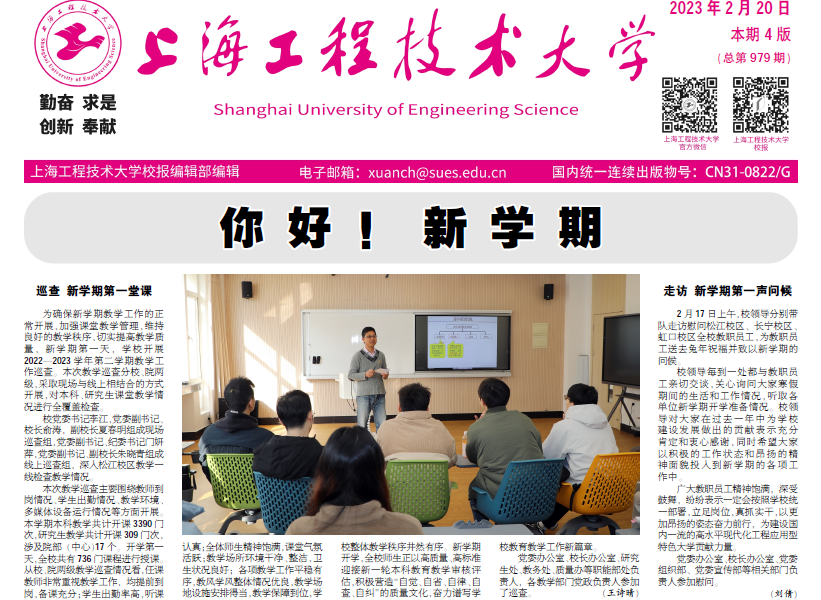 2月20日.pdf第一版你好!新学期巡查新学期第一堂课为确保新学期教学工作的正常开展,加强课堂教学管理,维持良好的教学秩序,切实提高教学质量,新学期第一天,学校开展2022—2023学年第二学期教学工作巡查。本次教学巡查分校、院两级,采取现场与线上相结合的方式开展,对本科、研究生课堂教学情况进行全覆盖检查。校党委书记李江,党委副书记、校长俞涛,副校长夏春明组成现场巡查组,党委副书记、纪委书记门妍萍,党委副书记、副校长朱晓青组成线上巡查组,深入松江校区教学一线检查教学情况。本次教学巡查主要围绕教师到岗情况、学生出勤情况、教学环境、多媒体设备运行情况等方面开展。本学期本科教学共计开课3390门次,研究生教学共计开课309门次,涉及院部(中心)17个。开学第一天,全校共有736门课程进行授课。从校、院两级教学巡查情况看,任课教师非常重视教学工作,均提前到岗,备课充分;学生出勤率高,听课认真;全体师生精神饱满,课堂气氛活跃;教学场所环境干净、整洁,卫生状况良好;各项教学工作平稳有序,教风学风整体情况优良,教学场地设施安排得当,教学保障到位,学校整体教学秩序井然有序。新学期开学,全校师生正以高质