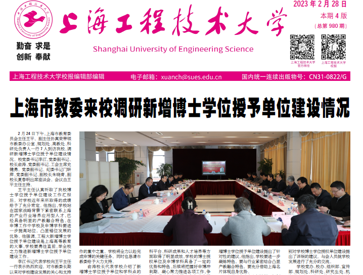 2月28日.pdf第一版上海市教委来校调研新增博士学位授予单位建设情况2月24日下午,上海市教育委员会主任王平,副主任孙真荣带领市教委办公室、规划处、高教处、科研处负责人一行7人到访yd2333云顶电子游戏,调研新增博士学位授予单位建设情况。校党委书记李江,党委副书记、校长俞涛,党委副书记、工会主席史健勇,党委副书记、纪委书记门妍萍,党委副书记、副校长朱晓青,副校长夏春明出席座谈会,会议由王平主任主持。王平主任认真听取了yd2333云顶电子游戏博士学位授予单位建设工作汇报后,对学校近年来所取得的成绩给予了充分肯定。他指出,学校站在国家战略背景下紧密联系上海的产业行业培养应用型人才,已经具备明显的产教融合特色,在申博工作中学校及申博学科要进一步提高站位,凸显错位发展的优势。他强调,工程大新增博士学位授予单位建设是上海高等教育的大事,学校要勇往直前,举全校之力推进新增博士学位授予单位建设工作。李江书记代表学校向王平主任一行表示热烈欢迎,对市教委长期以来对学校建设发展的关心和支持表示衷心感谢。他强调,博士学位授予单位的突破对于学校新一轮发展意义重大,申博建设是学校今年工作的重中之重,学校将全力以赴完成申博的关键任务,同时也恳请市教