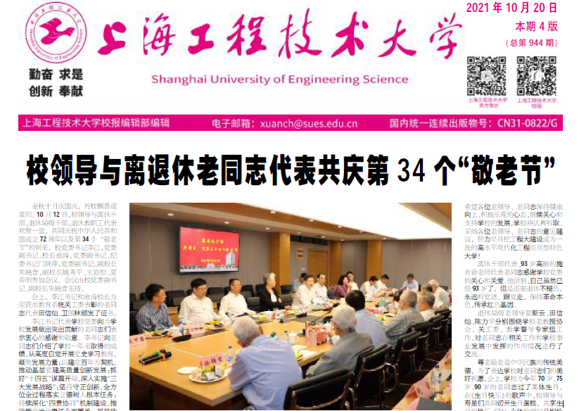 10月20日.pdf第一版校领导与离退休老同志代表共庆第34个“敬老节”金秋十月庆国庆,丹桂飘香迎重阳。10月12日,校领导与离休干部、退休局级干部、退休教职工代表欢聚一堂,共同庆祝中华人民共和国成立72周年以及第34个“敬老节”的到来。校党委书记李江,党委副书记、校长俞涛,党委副书记、纪委书记门妍萍,党委副书记、副校长朱晓青,副校长姚秀平、王岩松、夏春明参加会议。会议由校党委副书记、副校长朱晓青主持。会上,李江书记和俞涛校长为荣获市教育系统关工委表彰的老同志代表田信灿、卫国林颁发了证书。李江书记代表学校党委向为学校发展做出突出贡献的老同志们表示衷心的感谢和敬意。李书记向老同志们介绍了学校一年来取得的成绩,从高度自觉开展党史学习教育,凝聚发展力量;以建党百年为契机,推动基层党建高质量创新发展;抓好“十四五”谋篇开局,深入实施“三大发展战略”;坚持守正创新,全方位全过程落实立德树人根本任务;持续深化“四责协同”机制建设,推动管党治党责任全面覆盖、层层传导等五个方面介绍了学校重点工作。李江书记还恳请老同志们一如既往地支持学校工作,期待各位老领导、老前辈在深入学习党史和“七一”重要讲话精神的