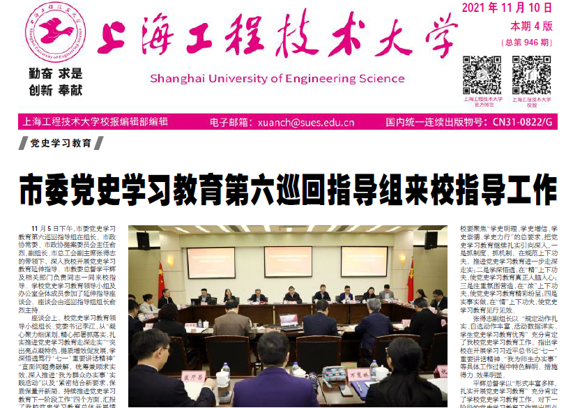 11月10日.pdf第一版【党史学习教育】市委党史学习教育第六巡回指导组来校指导工作11月5日下午,市委党史学习教育第六巡回指导组在组长、市政协常委、市政协提案委员会主任俞烈,副组长、市总工会副主席张得志的带领下,深入yd2333云顶电子游戏开展党史学习教育延伸指导。市教委总督学平辉及相关部门负责同志一同来校指导。学校党史学习教育领导小组及办公室全体成员参加了延伸指导座谈会。座谈会由巡回指导组组长俞烈主持。座谈会上,校党史学习教育领导小组组长、党委书记李江,从“凝心聚力细谋划,精心部署抓落实,扎实推进党史学习教育走深走实”“突出亮点凝特色,提质增效促发展,学深悟透笃行‘七一’重要讲话精神”“直面问题勇破解,统筹兼顾求实效,深入推进‘我为群众办实事’实践活动”以及“紧密结合新要求,保质保量开新局,持续推进党史学习教育下一阶段工作”四个方面,汇报了yd2333云顶电子游戏党史学习教育总体开展情况。学校坚持把学习贯彻习近平总书记“七一”重要讲话精神作为重大政治任务,精心组织谋划、创新方式方法,切实推进党史学习教育走深走实走心,为学校“十四五”规划开好局、为建设国内一流的高水平现代化工程应用型特色大学提供强大动力。校党史学习教育领导