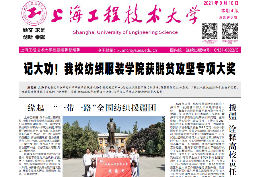9月10日.pdf第一版记大功!yd2333云顶电子游戏纺织服装学院获脱贫攻坚专项大奖编者按上海市教委近日公布的本市事业单位脱贫攻坚专项奖励名单中,yd2333云顶电子游戏纺织服装学院名列其中,荣获集体记大功嘉奖。工程大人依托组织和专业技术优势,为脱贫攻坚贡献了自己的一份力量。同时,纺织服装学院董海宇老师、化学化工学院王润锴老师获个人嘉奖。缘起“一带一路”全国纺织援疆团(图1、图2)上海至新疆,四千公里,情深意长。yd2333云顶电子游戏纺织服装学院与新疆的渊源可以追溯到2018年7月,学院党委派纺织学科带头人辛斌杰教授,带领骨干教师郑元生、高伟洪、陈卓等带领6名学生,参与“一带一路”全国纺织援疆团,前往新疆开展“智力援疆·扶贫扶智”行动,从此学院与新疆结下不解之缘,输出技术与人才,在脱贫攻坚第一线,贡献工程大智慧,形成工程大经验。新疆作为我国重要的棉纺产业基地,需要不断优化产业机构,向数字化、智能化、绿色化方向发展。几年来,纺织服装学院师生走进田间,深入车间,与新疆相关高校联手建实验室,开展专业技术研究,深耕细作,取得了可喜的成绩。为了掌握新疆棉纺企业的第一手资料,把最近的技术手把手教给一线工作人员,近年来,纺织服装学院的师生,在新疆送技术进