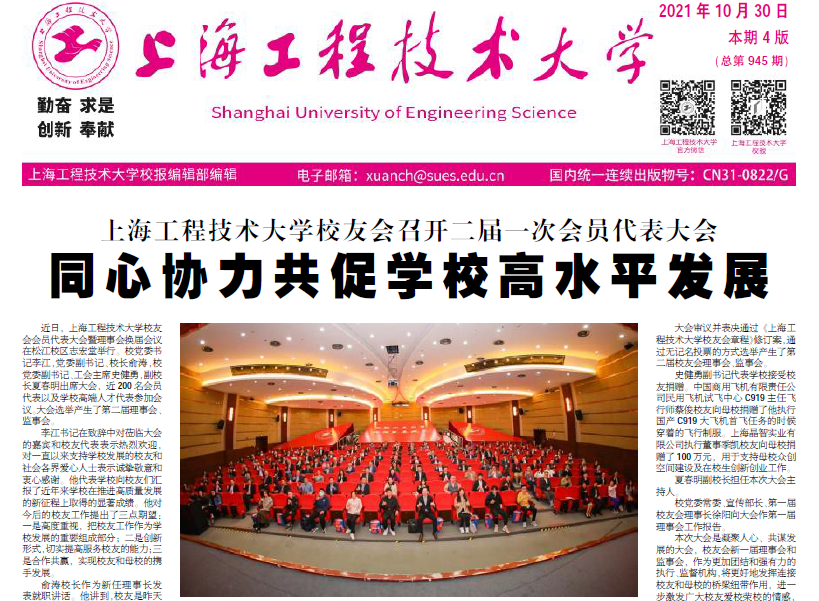 10月30日.pdf第一版上海工程技术大学校友会召开二届一次会员代表大会同心协力共促学校高水平发展近日,上海工程技术大学校友会会员代表大会暨理事会换届会议在松江校区志宏堂举行。校党委书记李江,党委副书记、校长俞涛,校党委副书记、工会主席史健勇,副校长夏春明出席大会,近200名会员代表以及学校高端人才代表参加会议。大会选举产生了第二届理事会、监事会。李江书记在致辞中对莅临大会的嘉宾和校友代表表示热烈欢迎,对一直以来支持学校发展的校友和社会各界爱心人士表示诚挚敬意和衷心感谢。他代表学校向校友们汇报了近年来学校在推进高质量发展的新征程上取得的显著成绩。他对今后的校友工作提出了三点期望:一是高度重视,把校友工作作为学校发展的重要组成部分;二是创新形式,切实提高服务校友的能力;三是合作共赢,实现校友和母校的携手发展。俞涛校长作为新任理事长发表就职讲话。他讲到,校友是昨天的学生,学生是明天的校友,学校的价值和意义就体现在校友身上。“十四五”期间,工程大计划要建成博士学位授权单位,在未来,要建成国内一流的现代化工程应用型特色大学。实现这些目标,离不开广大校友一如既往的关心和支持。学校将积极听取校友的
