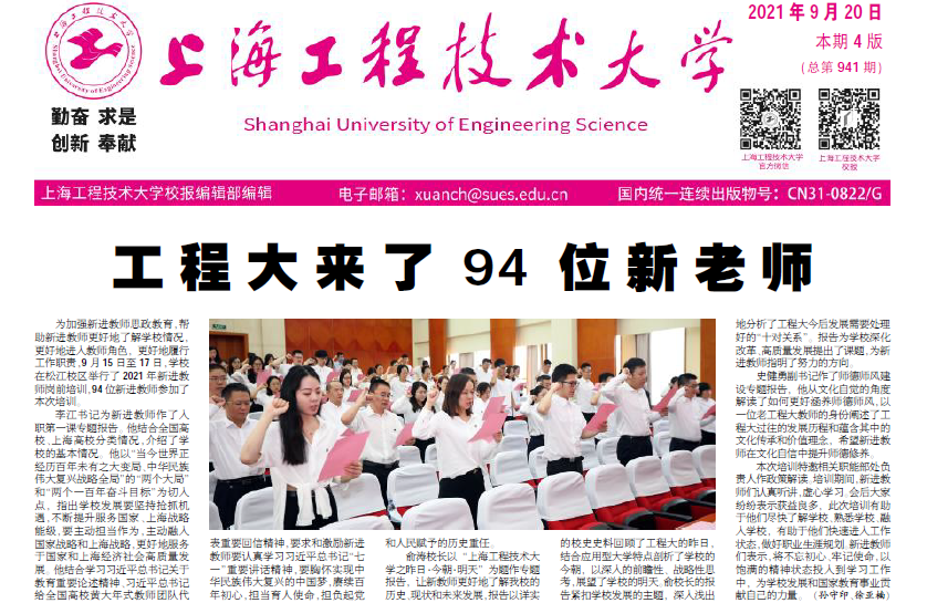 9月20日.pdf第一版工程大来了94位新老师为加强新进教师思政教育,帮助新进教师更好地了解学校情况,更好地进入教师角色,更好地履行工作职责,9月15日至17日,学校在松江校区举行了2021年新进教师岗前培训,94位新进教师参加了本次培训。李江书记为新进教师作了入职第一课专题报告。他结合全国高校、上海高校分类情况,介绍了学校的基本情况。他以“当今世界正经历百年未有之大变局、中华民族伟大复兴战略全局”的“两个大局”和“两个一百年奋斗目标”为切入点,指出学校发展要坚持抢抓机遇,不断提升服务国家、上海战略能级,要主动担当作为,主动融入国家战略和上海战略,更好地服务于国家和上海经济社会高质量发展。他结合学习习近平总书记关于教育重要论述精神、习近平总书记给全国高校黄大年式教师团队代表重要回信精神,要求和激励新进教师要认真学习习近平总书记“七一”重要讲话精神,要胸怀实现中华民族伟大复兴的中国梦,赓续百年初心,担当育人使命,担负起党和人民赋予的历史重任。俞涛校长以“上海工程技术大学之昨日•今朝•明天”为题作专题报告,让新教师更好地了解yd2333云顶电子游戏的历史、现状和未来发展,报告以详实的校史史料回顾了工程大的昨日