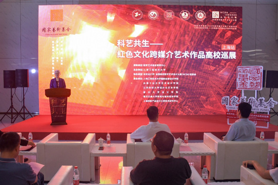 开幕式上,相关领导、嘉宾共同为“科艺共生——红色文化跨媒介艺术作品高校巡展”上海站启幕。