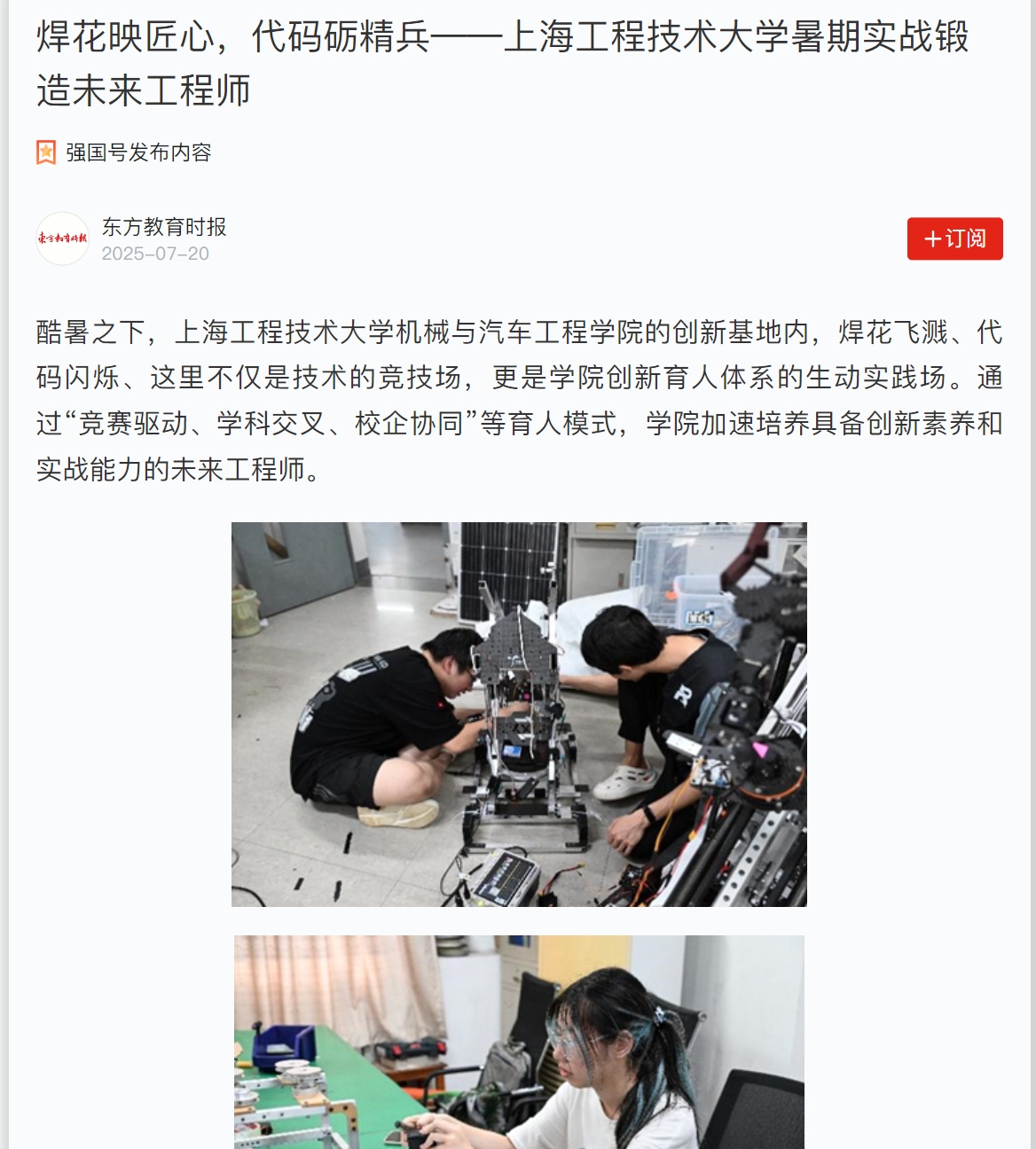 酷暑之下,上海工程技术大学机械与汽车工程学院的创新基地内,焊花飞溅、代码闪烁、这里不仅是技术的竞技场,更是学院创新育人体系的生动实践场。通过“竞赛驱动、学科交叉、校企协同”等育人模式,学院加速培养具备创新素养和实战能力的未来工程师。机甲擂台:“知行合一”课堂在机械创新基地内,木鸢Birdiebot战队的队员们正为RoboMaster机甲大师赛展开暑期“总攻”。没有枯燥的理论推演,只有真实的问题和挑战。机械组优化底盘结构,电控组调试供弹系统,算法组迭代视觉模型,策略组推演协同战术——每一个环节都是对课堂知识的深度激活。“从设计图纸到能打的机器人,中间隔着无数次调试的鸿沟。”一名队员感慨道。深夜的算法调试、结构件的推翻重来,考验着学生的专业能力,也锤炼了他们的团队协作与抗压能力。这种“以赛促学、以学致用”的模式,诠释了学院“知行合一”的育人理念。据悉,木鸢战队是学院创新育人体系的缩影。通过国家级高水平竞赛驱动,学院彻底打破学科壁垒,让学生从需求分析到赛场验证全程主导。这种沉浸式的项目制学习,将被动接受知识转化为主动构建能力,点燃了学生的创新引擎。赛道砺炼:校企协同育匠才38℃的高温下,大学