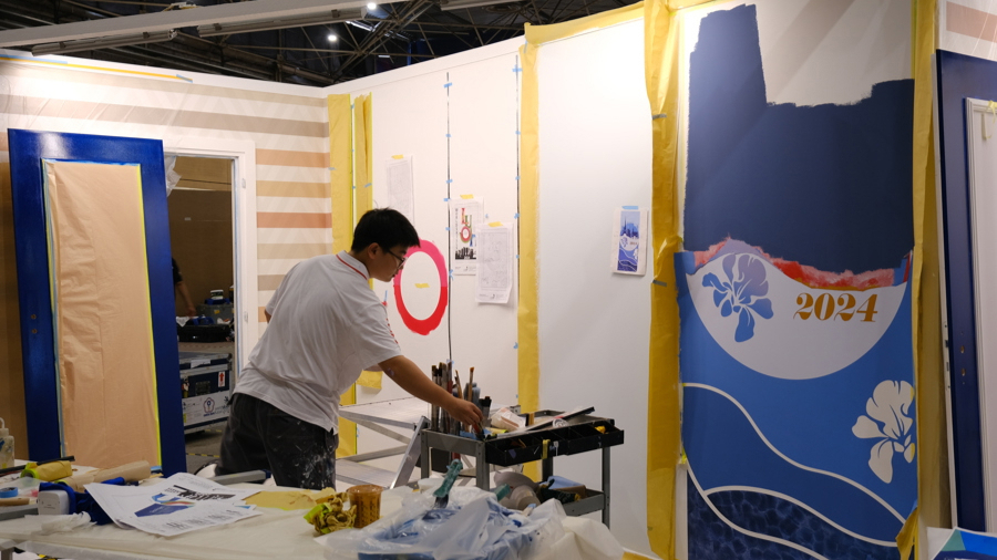 从第47届世界技能大赛媒体中心走到赛场,最先映入眼帘的是油漆与装饰项目比赛现场。在里昂这些天,记者每次去采访路上都会顺手拍下中国选手的进度:起初只有一堵白墙,接着有了轮廓,有了色彩,有了图案……最后,一幅绘满蓝紫色鸢尾花的墙画在赛场缓缓盛放。