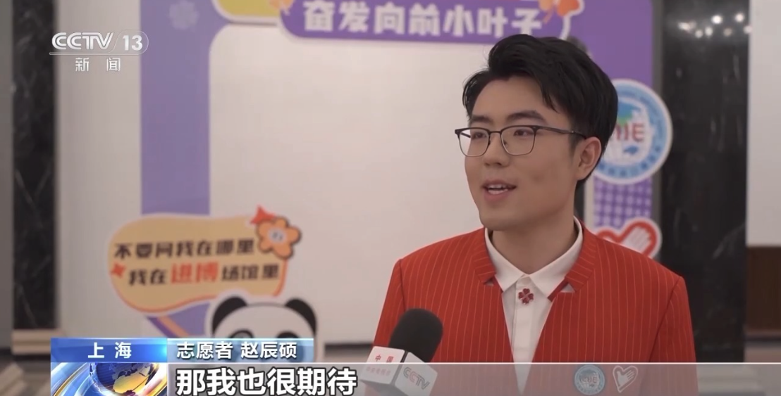 志愿者 赵辰硕:很期待,能在接下来的会期志愿服务中与其他的“小叶子”交朋友,我们会一起践行,在上岗仪式上许下的进博誓言。