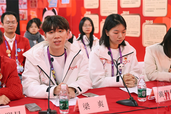 上海海事大学的袁熙旻是一名三年级“小叶子”,在服务进博中强化理论学习是他的鲜明感受。上岗前,学校各基层团支部都围绕党的二十届三中全会精神开展了学习实践活动。上岗后,临时团支部也成了“小叶子”们共同学习、交流研讨的平台。这让他更加自信、更加坚定地在进博会这个世界舞台上领悟“国之大者”,展现挺膺担当的青春风采。