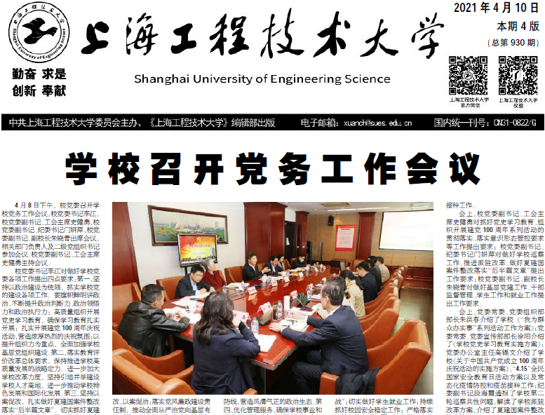 4月8日下午,校党委召开学校党务工作会议,校党委书记李江,校党委副书记、工会主席史健勇,校党委副书记、纪委书记门妍萍,校党委副书记、副校长朱晓青出席会议,相关部门负责人及二级党组织书记参加会议。校党委副书记、工会主席史健勇主持会议。