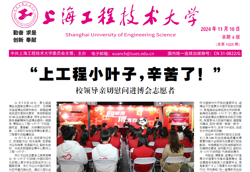 向前进,博青春。进博会不仅是展示中国青年形象的重要舞台,是志愿服务实践育人的重要平台,更是彰显广大上工程青年与中国式现代化“双向奔赴”的一堂精彩而生动的思政大课。上工程青年在进博会服务中体悟看得见、摸得着的家国责任,以实际行动践行新时代青年的使命与担当,青春为中国式现代化挺膺担当。(团委)