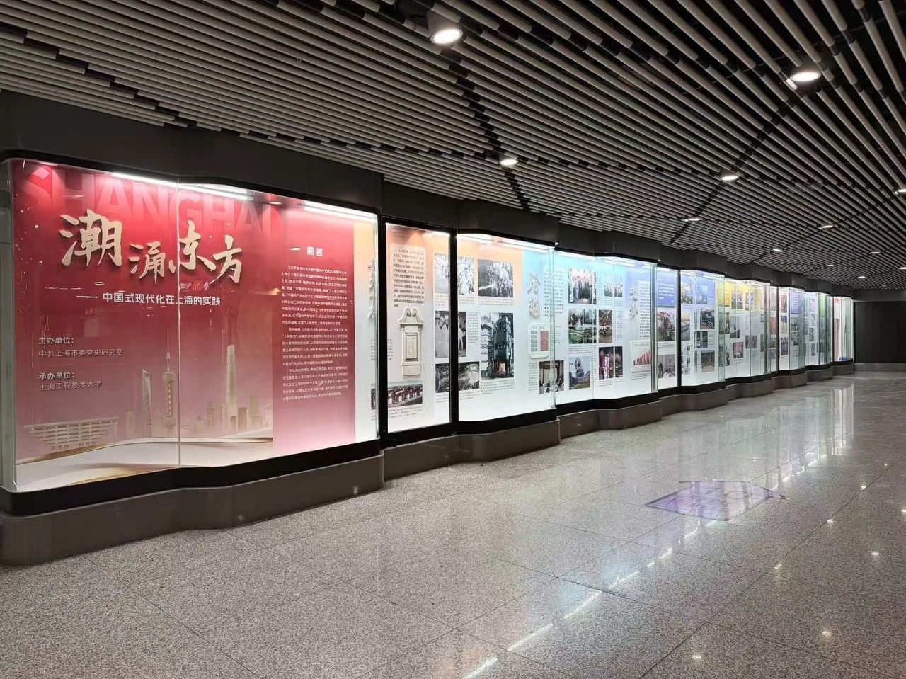 12月3日,“潮涌东方——中国式现代化在上海的实践”地铁展在人民广场站正式启动。市教育卫生工作委员会副书记、市教育委员会副主任顾红亮,市委党史研究室副主任唐洪涛,上海工程技术大学党委副书记、副校长徐阳为展览启动。展览由中共上海市委党史研究室主办,上海工程技术大学承办。该展览以中国式现代化在上海的实践为主题主线,以图文并茂和同步播放《潮涌东方——中国式现代化在上海的实践》视频的表现形式,生动展现上海从“十里洋场”到“人民城市”,从解放初的百废待兴到社会主义现代化国际大都市的欣欣向荣,从改革开放初的摸着石头过河到改革开放排头兵、创新发展先行者,到更高水平改革开放的开路先锋的奋斗历程。目前,该展览已登陆人民广场、陕西南路地铁站,面向公众开放。广大市民、游客可以通过展览,了解上海75年的历史巨变,感受上海这座人民城市的初心与雄心,从历史中汲取奋进力量。