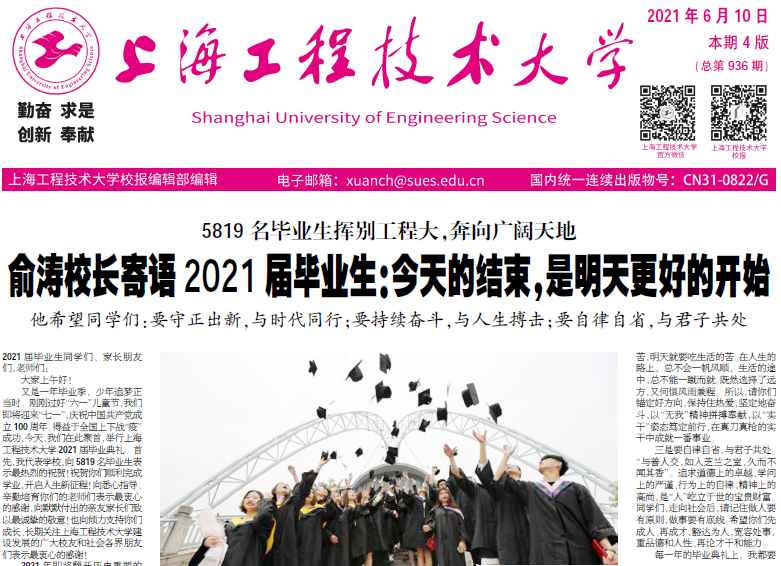 又是一年毕业季,少年追梦正当时。刚刚过好“六一”儿童节,我们即将迎来“七一”,庆祝中国共产党成立100周年。得益于全国上下战“疫”成功,今天,我们在此聚首,举行上海工程技术大学2021届毕业典礼。首先,我代表学校,向5819名毕业生表示最热烈的祝贺!祝贺你们顺利完成学业,开启人生新征程!向悉心指导、辛勤培育你们的老师们表示最衷心的感谢,向默默付出的亲友家长们致以最诚挚的敬意!也向倾力支持你们成长、长期关注上海工程技术大学建设发展的广大校友和社会各界朋友们表示最衷心的感谢!