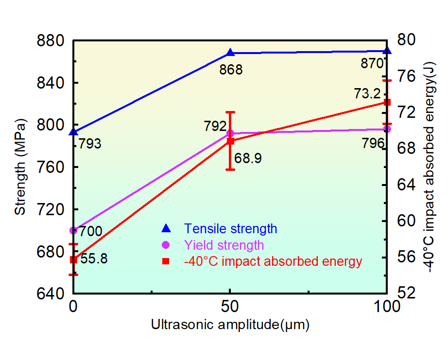 在超声振幅对超高强钢增材制造组织和性能的研究中,团队发现,随着超声振幅的增加,自制的添加1% CeO2超高强钢金属粉芯焊丝熔敷金属中的稀土复合夹杂物在晶界处的偏析减少,从而显著提高了材料的综合力学性能。特别是在超声振幅为100µm时,熔敷金属的平均夹杂物尺寸比超声振幅为0µm时减小了约23.4%,熔敷金属的抗拉强度、屈服强度和冲击韧性均得到了显著提升(分别达到870 MPa、796 MPa、73.2J)。