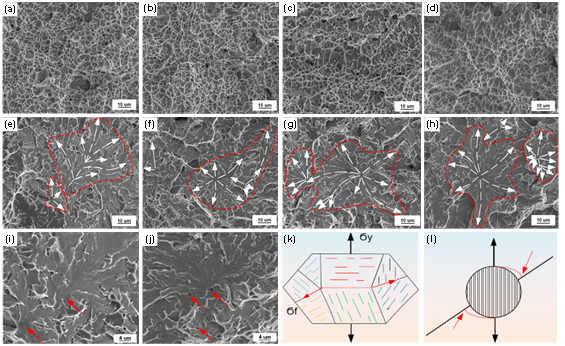 Fig. 2. SEM images of dimples and cleavage facets in weld metals and the mechanisms of crack initiation:(a) and (e) wire no. 1, (b) and (f) wire no. 2, (c) and (g) wire no. 3, (d) and (h) wire no. 4, (i) and (j) surface shear stress induced boundary cracking of bainite clusters, (k) and (l) surface shear stress-induced decohesion of inclusion.