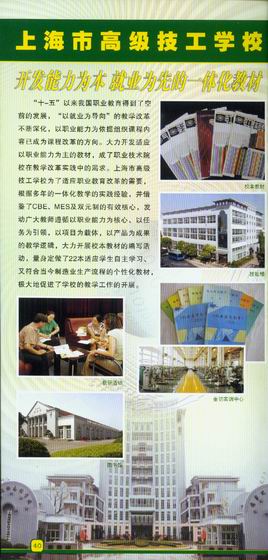 上海市高级技工学校根据多年来开展一体化教学的实践经验,大力开发能力为本、就业为先的一体化校本教材,相继出版了一批既适应学生自主学习又符合当今制造业生产流程的个性一体化校本教材。在国家劳动和社会保障部出版社出版的全国中等职业技术学校电工模块教材丛书中,上海市高级技工学校编写了《变频调速技术》、《变流技术及应用》、《气液传动》、《钳工基本技能训练》、《电气控制线路安装与维修》等5个模快教材。此外凝聚数10位教师多年辛勤教学心血的22本校本教材成功参加了2006年上海市中等职业学校首届校本教材展示交流会, 并荣获国家劳动和社会保障部职业培训教材建设突出贡献奖。