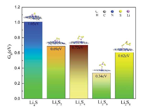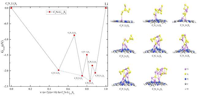 锂硫电池因具有低成本、环境友好等特点被认为是最有发展潜力的下一代高能量密度储能器件之一,其正极材料单质硫的理论比容量和比能量可高达1675 mAh/g和2567 Wh/kg,是目前商用锂过渡金属氧化物正极的五倍。然而,锂硫电池中多硫化物的穿梭效应导致的循环性能差是其面临的主要挑战,严重影响了商业化进程。该项研究中作者采用了量子计算化学与遗传算法相结合的全局结构搜索方法论证了C2N纳米片作为锂硫电池阴极材料的可行性,在考虑溶剂效应的情况下,计算结果表明多硫化物能够稳定无溶解地吸附在C2N纳米片基底上,从而较好地抑制其穿梭效应,且在加入C2N基底材料体系比能量仍高达1122.21 Wh/kg;能带计算表明尽管纯净C2N纳米片是具有1.96eV带隙的半导体,在吸附多硫化物后表现为金属性,所以也有效地改善了锂硫电池阴极材料的导电性;以上表明C2N纳米片是很有潜力的锂硫电池的阴极材料。