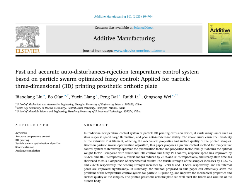 近日,机械与汽车工程学院钱波副教授指导2022级研究生刘彪强在增材制造领域顶级期刊《Additive Manufacturing》(中科院SCI期刊一区Top期刊,影响因子10.3)发表了最新研究成果“Fast and accurate auto-disturbances-rejection temperature control system based on particle swarm optimized fuzzy control: Applied for particle three-dimensional (3D) printing prosthetic orthotic plate”。