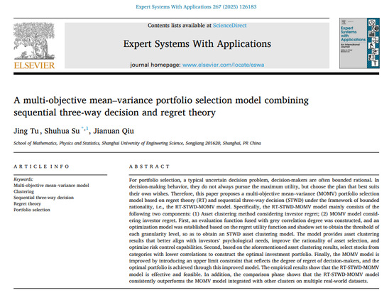 近日,数理与统计学院苏淑华教授指导2024届研究生涂晶在人工智能和计算机科学领域TOP期刊《Expert Systems With Applications》(中科院SCI期刊一区Top期刊,影响因子7.5)上发表了最新研究成果“A multi-objective mean–variance portfolio selection model combining sequential three-way decision and regret theory”。