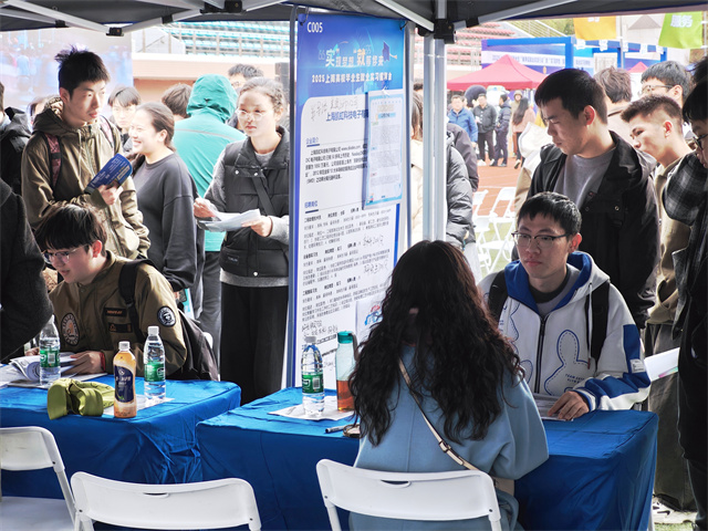 除了本校学生,不少外校学生组团来到招聘会。上海应用技术大学资源环境工程专业2025届硕士生李美霞带着15份简历,和同学结伴而来。招聘会现场,上海电器学科研究所(集团)有限公司的岗位吸引了她的目光。投递简历,相互交流,深化对职场和市场选才的认知。