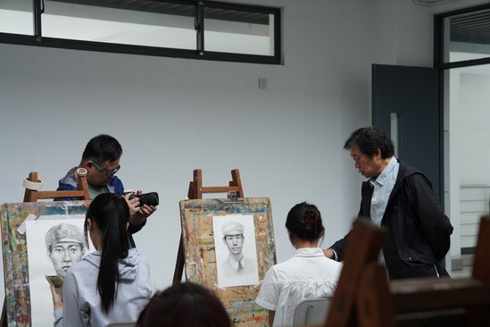 上海工程技术大学艺术设计学院教授平龙指导学生为沈辛之画像。