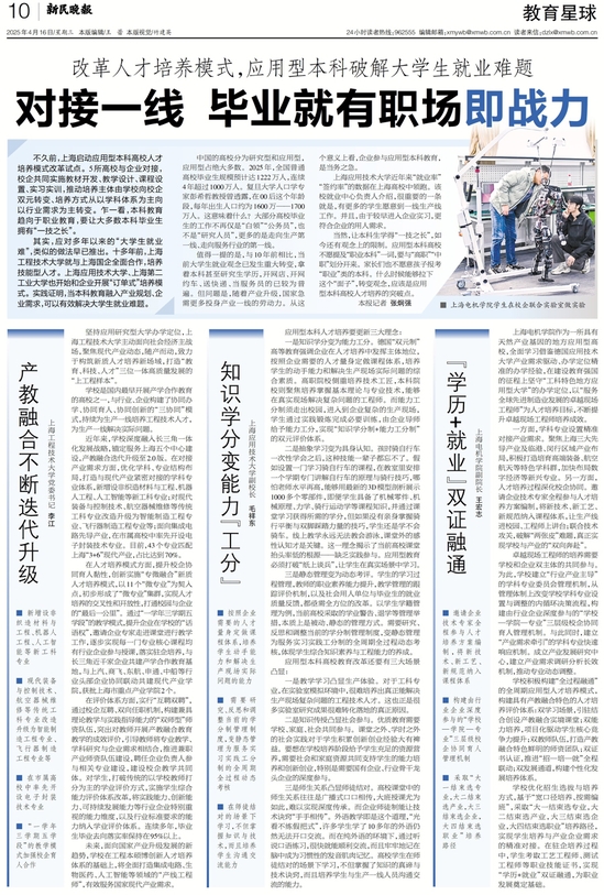 坚持应用研究型大学办学定位,上海工程技术大学主动面向社会经济主战场,聚焦现代产业动态,随产而动,致力于构筑新质人才培养新场域,打造“教育、科技、人才”三位一体高质量发展的“上工程样本”。