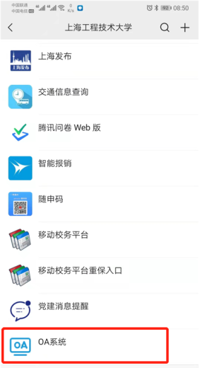 2.移动端登录:微信企业号“上海工程技术大学”中的“OA系统”应用。
