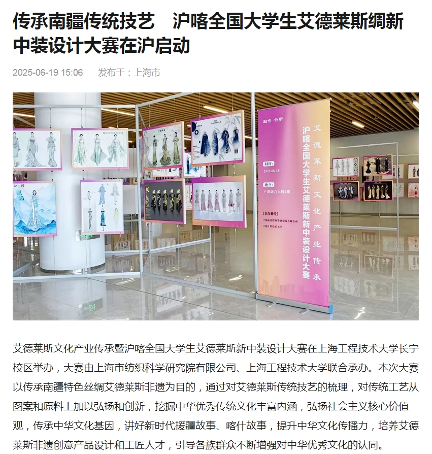 艾德莱斯文化产业传承暨沪喀全国大学生艾德莱斯新中装设计大赛在上海工程技术大学长宁校区举办,大赛由上海市纺织科学研究院有限公司、上海工程技术大学联合承办。本次大赛以传承南疆特色丝绸艾德莱斯非遗为目的,通过对艾德莱斯传统技艺的梳理,对传统工艺从图案和原料上加以弘扬和创新,挖掘中华优秀传统文化丰富内涵,弘扬社会主弘扬社会主义核心价值观,传承中华文化基因,讲好新时代援疆故事、喀什故事,提升中华文化传播力,培养艾德莱斯非遗创意产品设计和工匠人才,引导各族群众不断增强对中华优秀文化的认同。