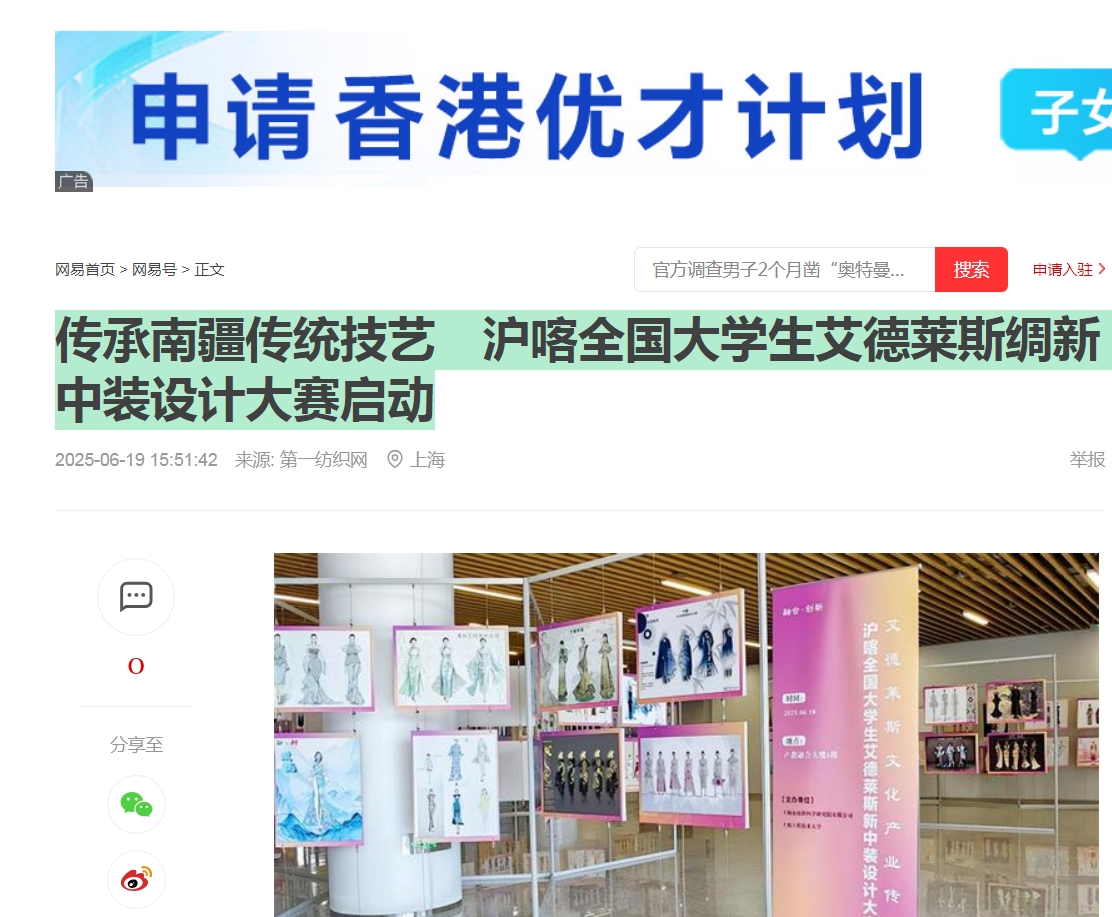 艾德莱斯文化产业传承暨沪喀全国大学生艾德莱斯新中装设计大赛在上海工程技术大学长宁校区举办,大赛由上海市纺织科学研究院有限公司、上海工程技术大学联合承办。本次大赛以传承南疆特色丝绸艾德莱斯非遗为目的,通过对艾德莱斯传统技艺的梳理,对传统工艺从图案和原料上加以弘扬和创新,挖掘中华优秀传统文化丰富内涵,弘扬社会主义核心价值观,传承中华文化基因,讲好新时代援疆故事、喀什故事,提升中华文化传播力,培养艾德莱斯非遗创意产品设计和工匠人才,引导各族群众不断增强对中华优秀文化的认同。