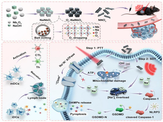 针对当前Na⁺/K⁺ ATPase抑制剂强心苷临床疗效有限与毒性难题,团队开发了一种具有晶格畸变和富氧空位的铌基钙钛矿(NaNbO3,NNOx)纳米颗粒。NNOx整合了压电催化和光热特性,在超声和近红外II激光的协同刺激下,一方面释放外源性Na⁺以升高肿瘤细胞内Na⁺浓度,另一方面高效生成活性氧(ROS),诱导线粒体损伤并抑制ATP合成,进而降低Na⁺/K⁺ ATP酶活性,阻碍Na⁺外排,进一步加剧胞内Na⁺蓄积,引发严重的离子失衡风暴。这种离子过载机制会进一步触发细胞渗透肿胀,诱导细胞焦亡,激活强大的抗肿瘤免疫应答,实现对肿瘤生长的有效抑制。该研究构建了“离子干扰-焦亡-免疫激活”级联治疗模式,为靶向离子稳态的肿瘤免疫治疗提供了新思路。
