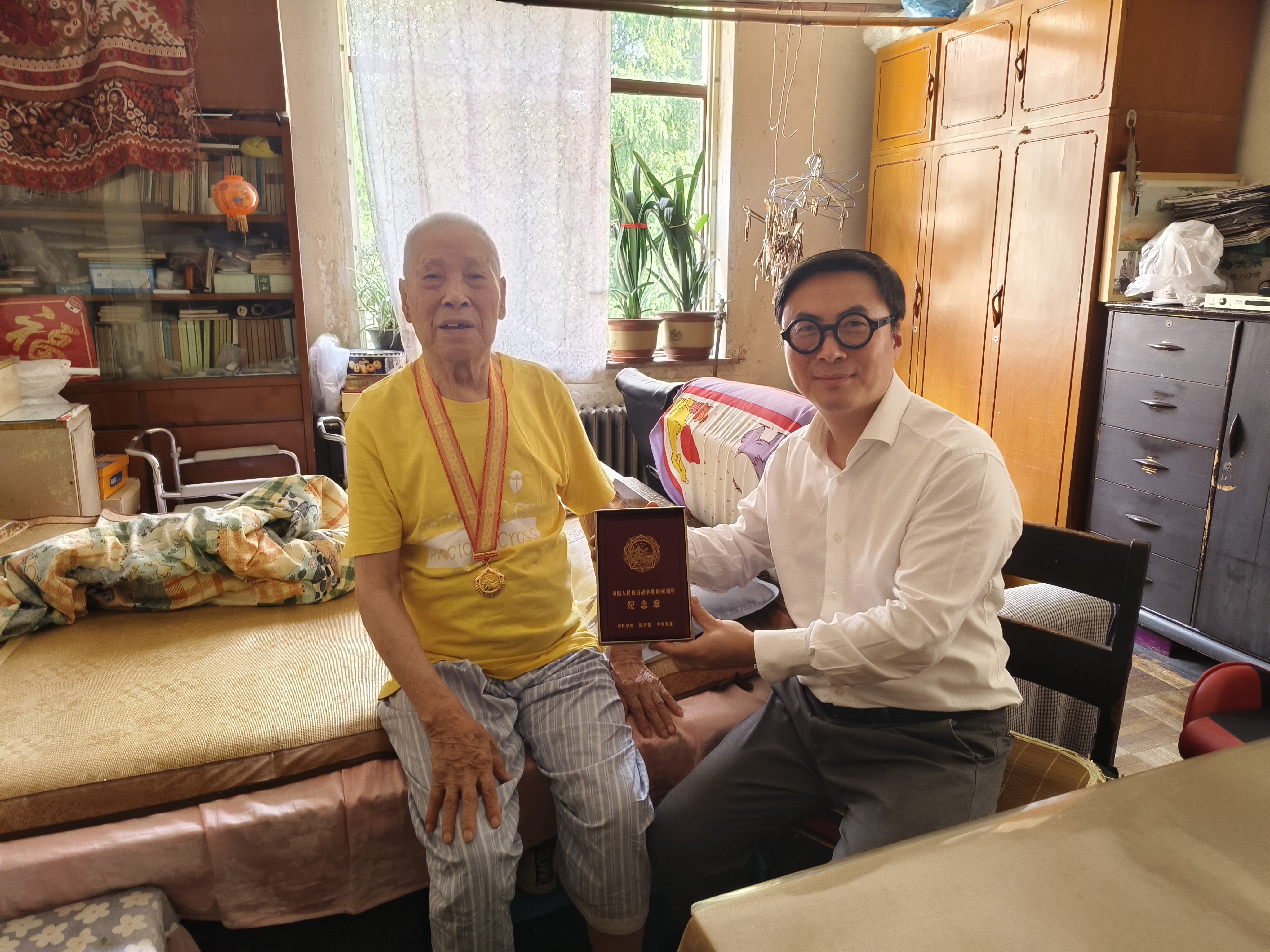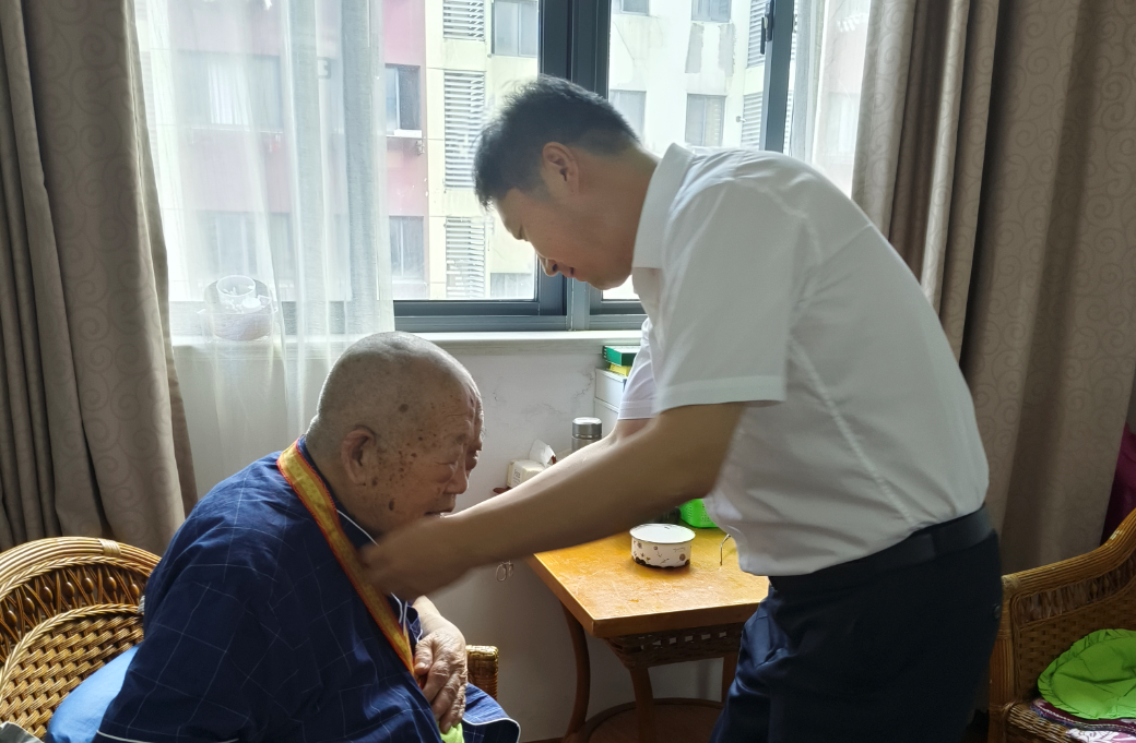 娄永琪登门慰问了近99岁的阮顺祥同志,为他佩戴“中国人民抗日战争胜利80周年”纪念章。阮顺祥同志于抗日战争时期参加冀察军区领导下的八路军游击队,曾参加解放天津的战斗和北平和平解放的工作,为保家卫国奉献了青春热血。娄永琪关切地询问了老同志的身体状况、日常生活条件以及家庭情况,祝愿老同志健康长寿、生活美满。
