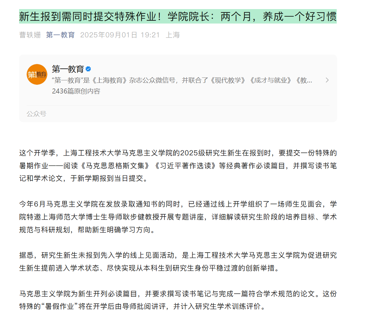这个开学季,上海工程技术大学马克思主义学院的2025级研究生新生在报到时,要提交一份特殊的暑期作业——阅读《马克思恩格斯文集》《习近平著作选读》等经典著作必读篇目,并撰写读书笔记和学术论文,于新学期报到当日提交。