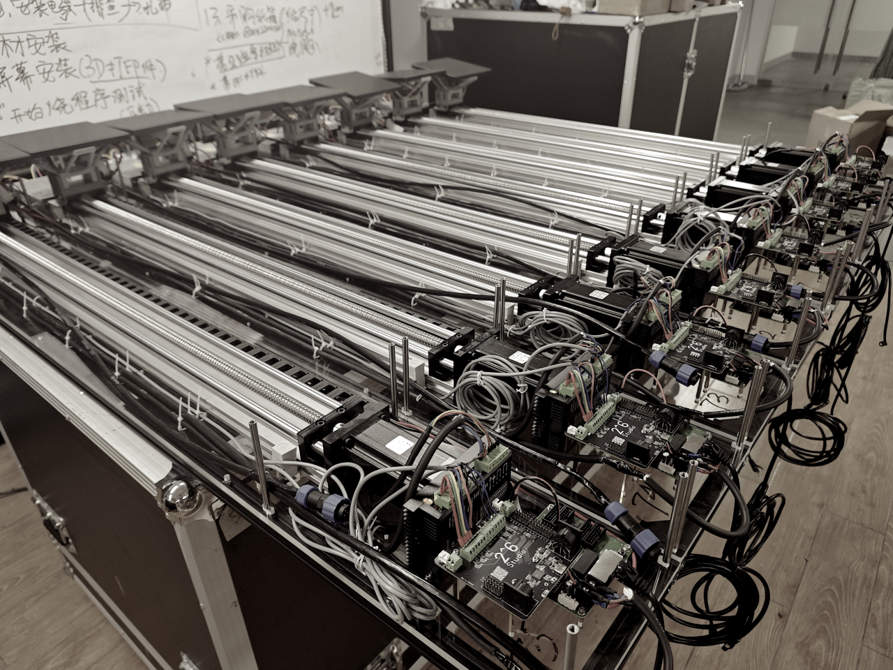 陈俊恺副教授负责主会场灯光交互装置。在动态装置项目的研究与制作过程中,声音软体的控制触发、LED屏幕阵列的编排、机械部件的装配测试和电控系统的设计编程,其难点在于工程与设计的跨界融合,并符合开幕式表演的实时触发与交互。其整体创意亮点是将工程技术变迁为诗意的画笔,将(点、线、面)的几何图形的变化应用于灯光语言之中,将算法化身为舞蹈,在空间中穿梭,并与音画同步。在机器人的挥舞下,交相辉映。