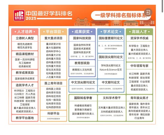 软科中国最好学科排名覆盖98个一级学科和5个专业学位类别,指标体系涵盖人才培养、平台项目、成果获奖、学术论文、高端人才5大类19项指标,含200多项观测变量,今年新增教学平台基地(含国家级虚拟仿真实验教学中心等)及“一带一路”联合实验室等部委科研创新平台指标。