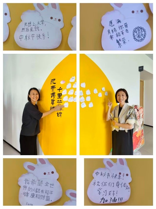 “明月寄相思”——寄语祝福。学生们在“千里共婵娟”留言板上写下对亲人、朋友的思念与祝福,让思绪随明月传递四方。