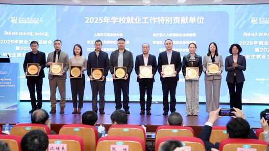 校党委副书记朱晓青为松江区人力资源和社会保障局、上海市浙江商会等17家单位颁发了2025年学校就业工作特别贡献单位奖。