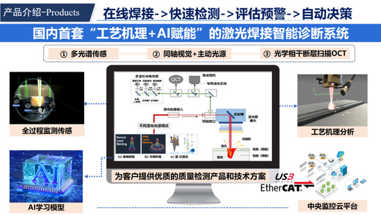 其核心技术创新在于将焊接执行模块与智能监测、动态管控模块深度集成,搭配自主知识产权的“工艺机理+AI赋能”的激光焊接智能诊断系统。主要由多光谱传感、主动视觉和光学相干断层扫描OCT三种光学传感技术构成,通过集成工艺机理、全过程监测、AI学习模型和中央监控四个关键步骤,形成 “加工即监测、监测即管控” 的闭环技术体系,解决传统激光装备“重加工、轻诊断、难管控”的行业痛点。