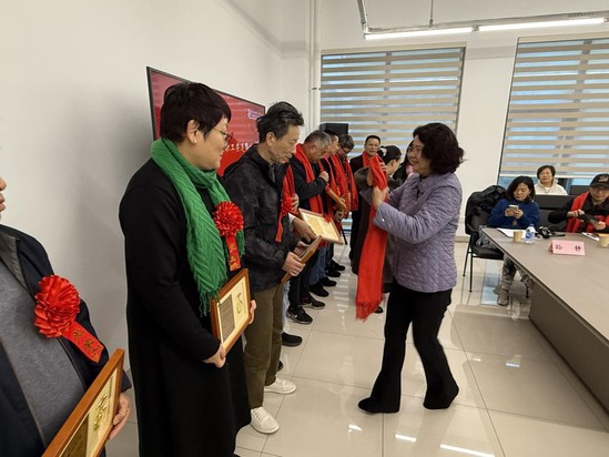 朱晓青为新退休教职工颁发荣退证书、佩戴红围巾