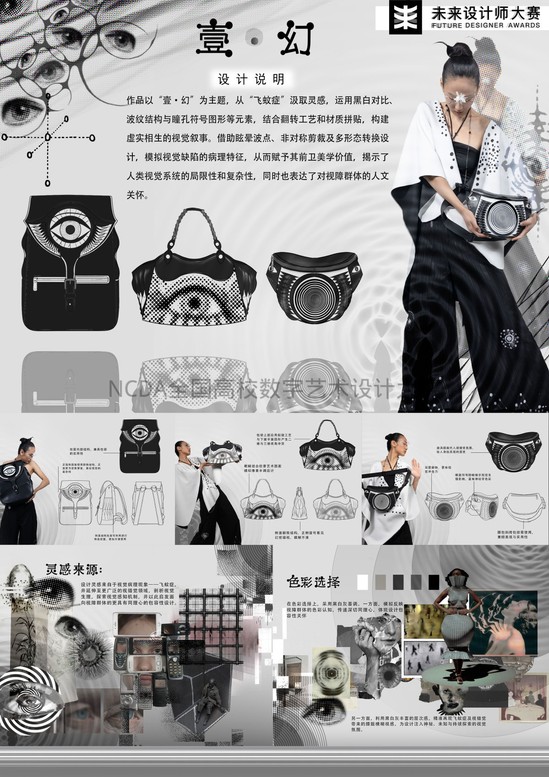 作品简介:设计以·为主题,从飞蚊症汲取灵感,运用黑白对比、波纹结构与瞳孔符号图形等元素,结合翻转工艺和材质拼贴,构建虚实相生的视觉叙事。借助眩晕波点、非对称剪裁及多形态转换设计,模拟视觉缺陷的病理特征,从而赋予其前卫美学价值。揭示了人类视觉系统的局限性和复杂性,同时也表达了对视障群体的人文关怀。