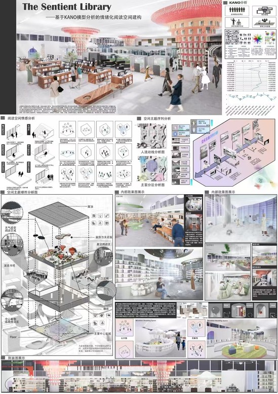 作品简介:该阅读空间以“情感化设计”为核心理论,使用KANO模型进行需求优先级分析,以此来构建多层次的空间阅读体验,营造与自然呼应的感官氛围。整体动线设计以感官体验为引导,通过情绪的渐进变化,使用户从产生兴趣、沉浸其中,到最终在留白中静心释然,形成一处疗愈心灵的阅读场所。